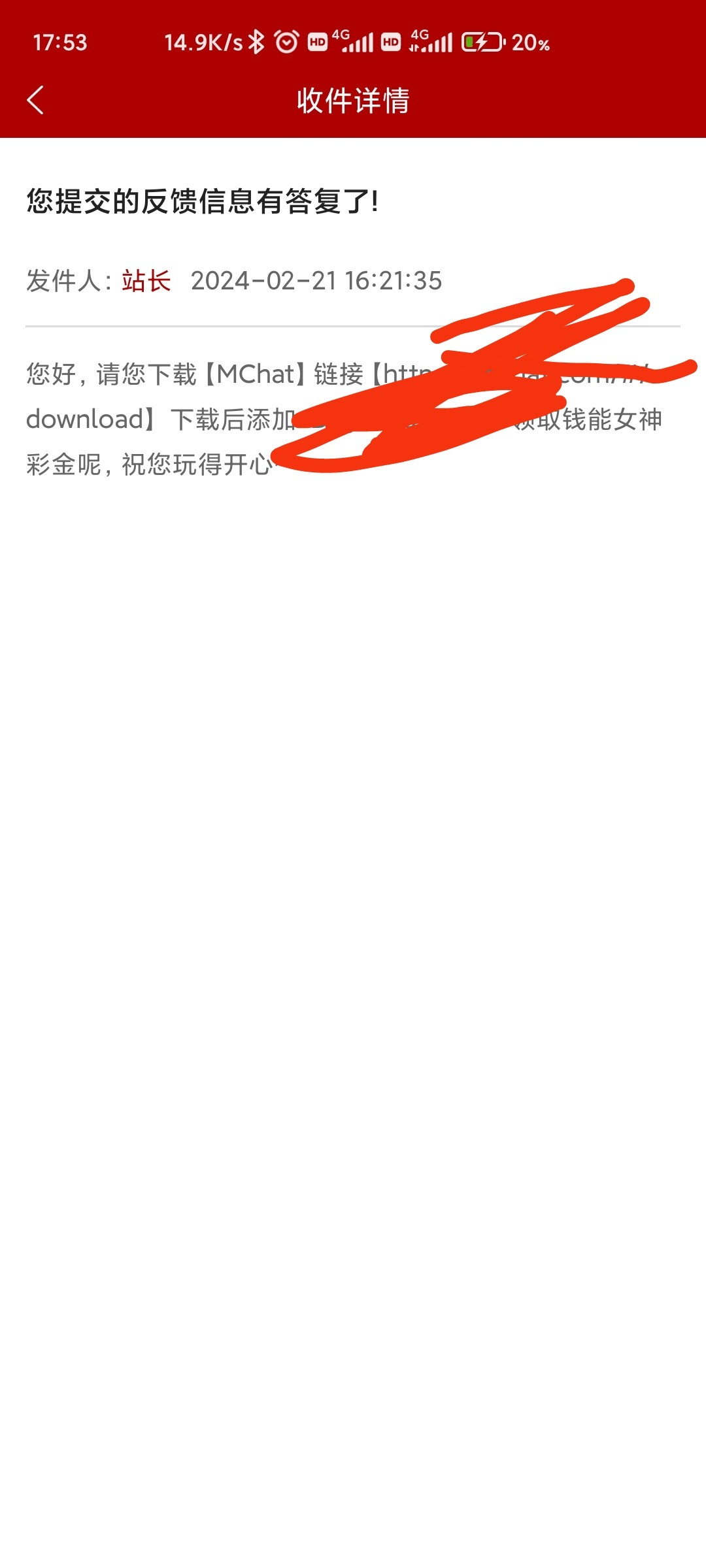 7.31号前注册,7.31以后存过一万,没收到站内信,今天提交反馈,站长回复我联系方式了