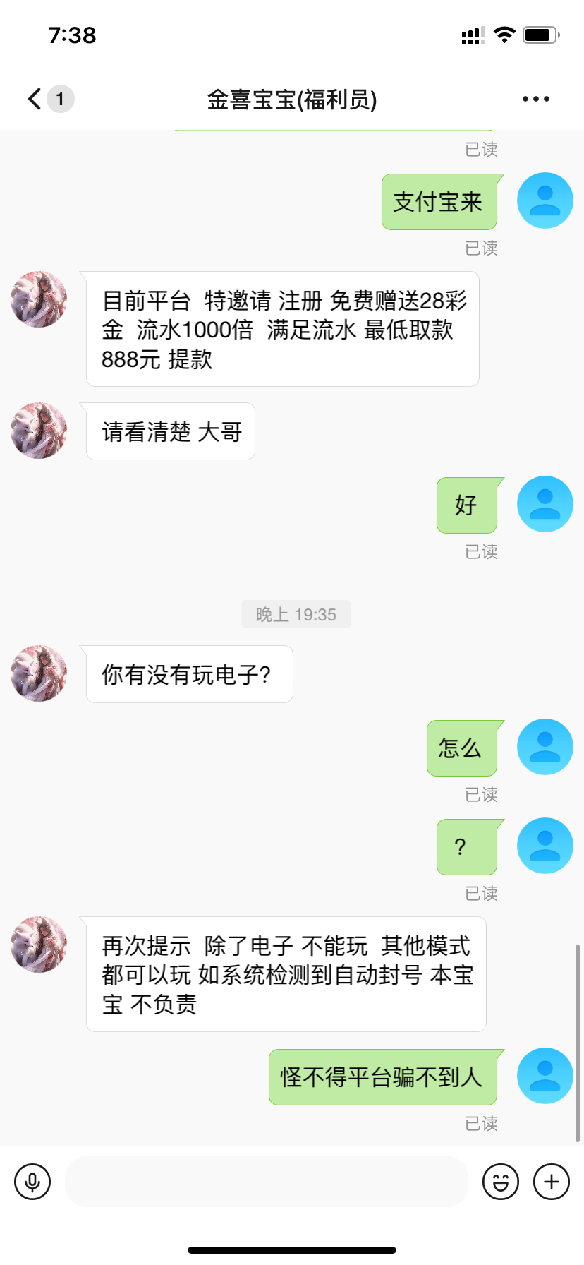 前天朋友接到电话推荐我注册了个账号!今天充值100领88彩金,让打10倍流水最低888提款,取款直接封号问客服说刷流水
