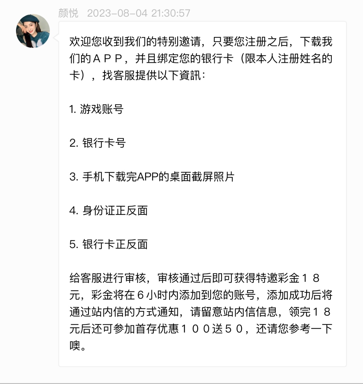 欢迎您收到我们的特别邀请,只要您注册之后,下载我们的APP,并且绑定您的银行卡(限本人注册姓名的卡),找客服提供以下資訊:
