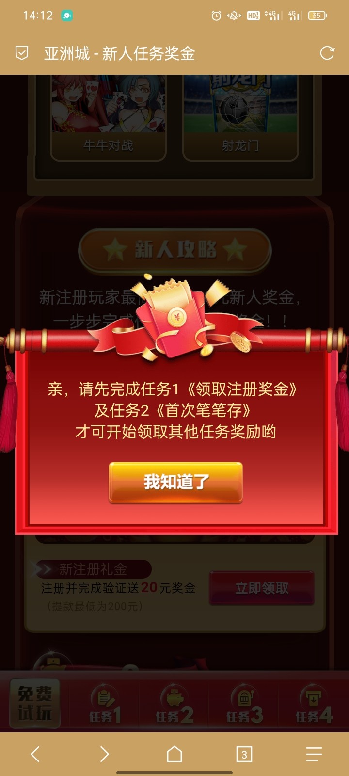 注册绑卡绑手机号 注册绑定好退出登录 输入密码登录的下面有个新手试玩 点新手试玩进去领  然后在我的优惠领取 不限制游戏 10倍  最低200提现