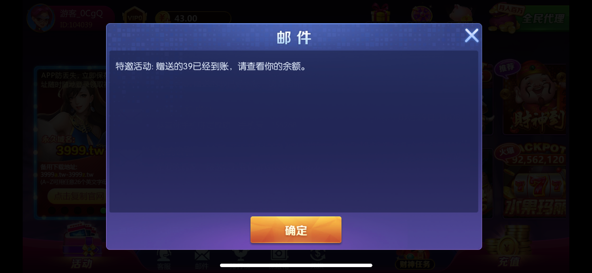 新用户注册绑定手机号码立即获得4元彩金,再绑定银行卡和支付宝后,符合申请条件的账号10分钟之内系统自动派送39元彩金
