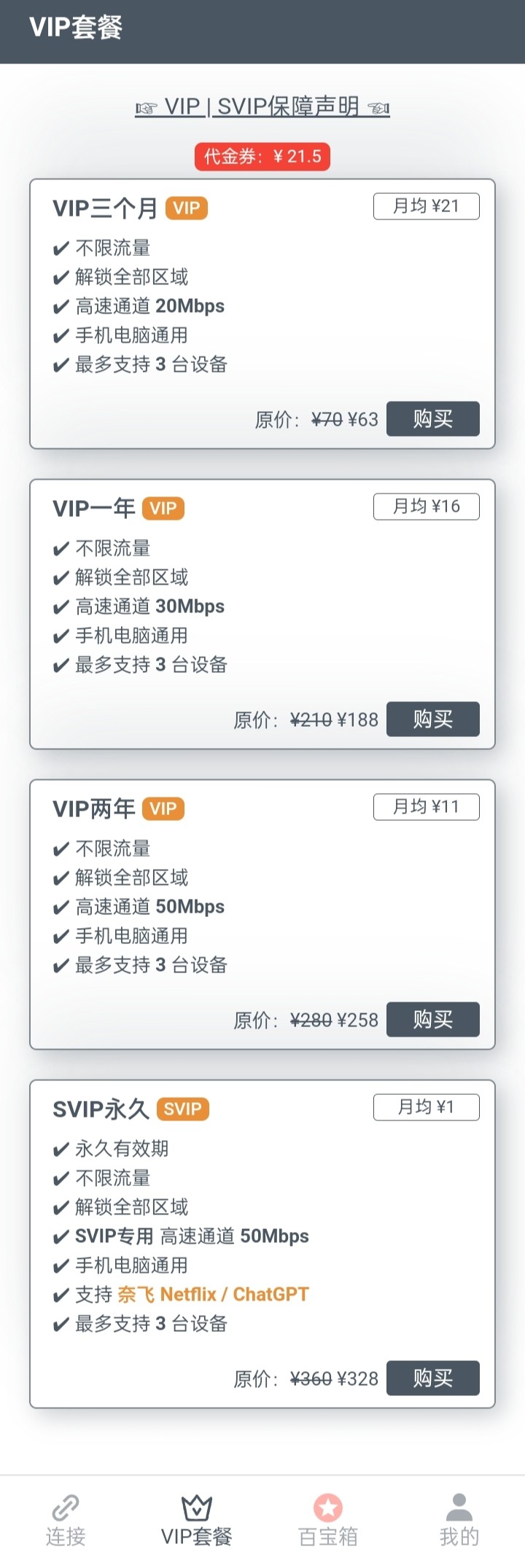 新用户刚注册可以免费获得30天每日签到可以获得免费时长+代金卷(积攒足够多了可以用来购买VIP)