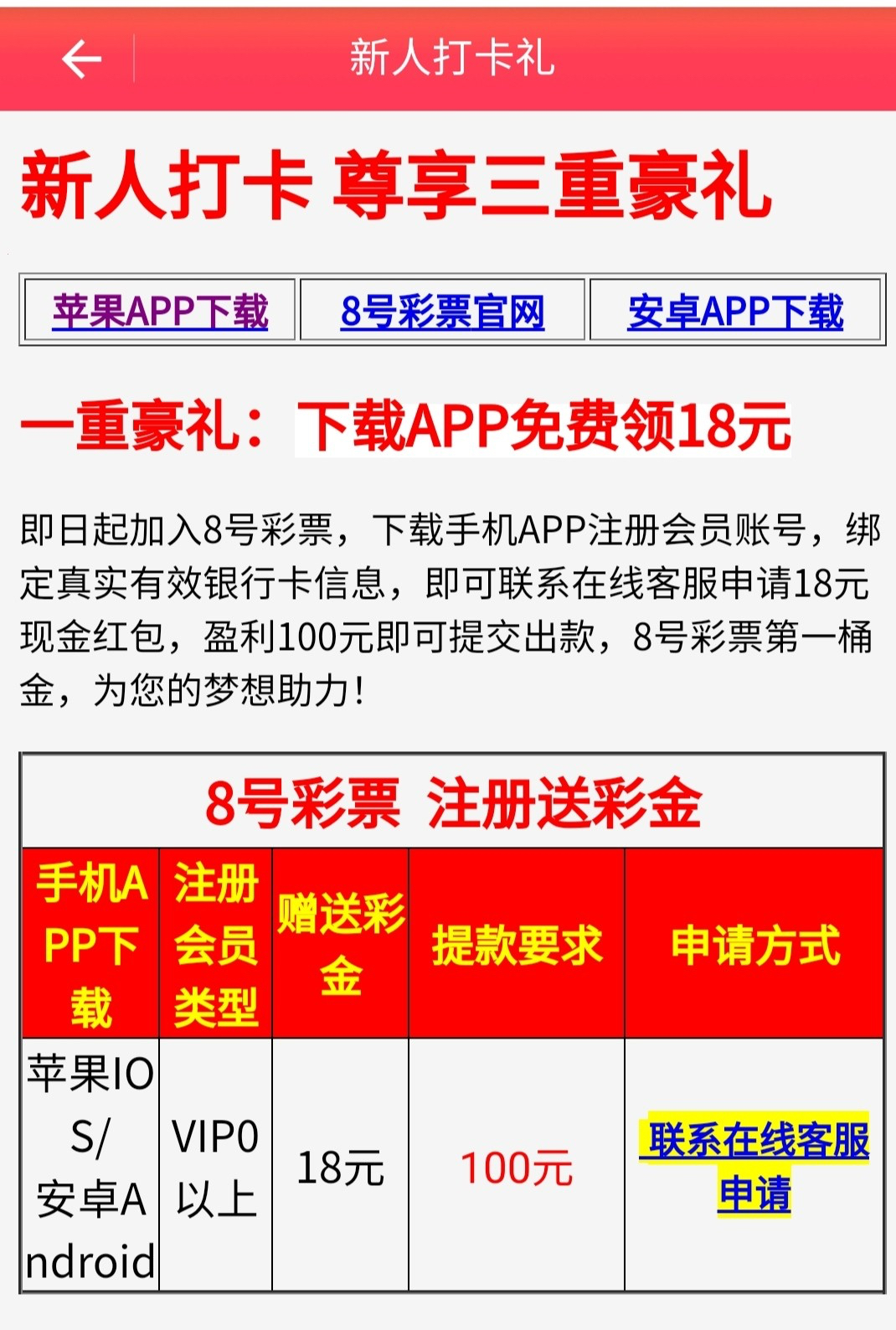 新用户注册完善个人信息 下载平台APP联系在线客服截图APP桌面即可获得18彩金 满100即可提现!