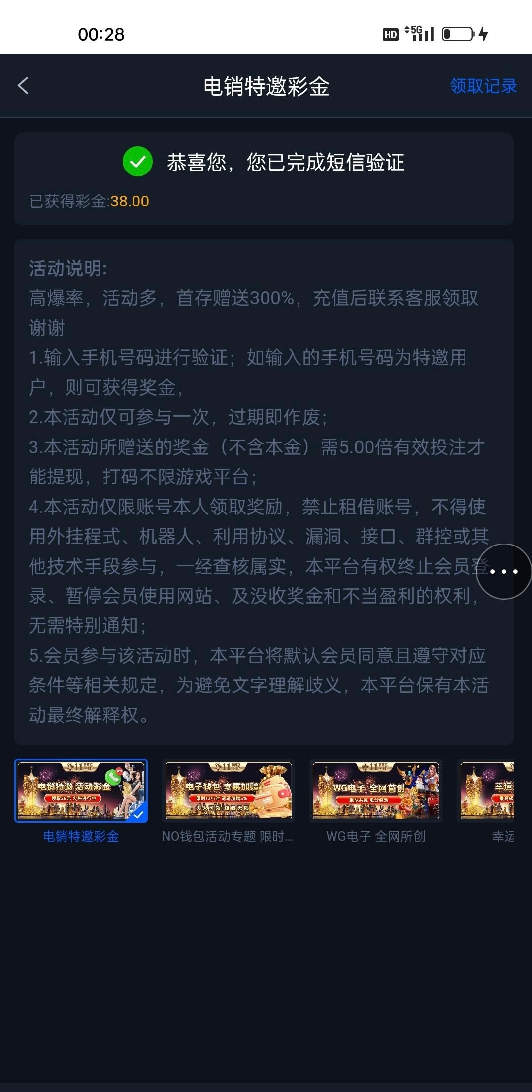 我是接到电话的,叫我注册账号然后在优惠活动里面自助领取的,你们可以注册账号之后去看一看能领取,不能领取的话就去找在线客服说领电销彩金。官方网站:11.vip   电话网站:233.st(没打出来提现自测)