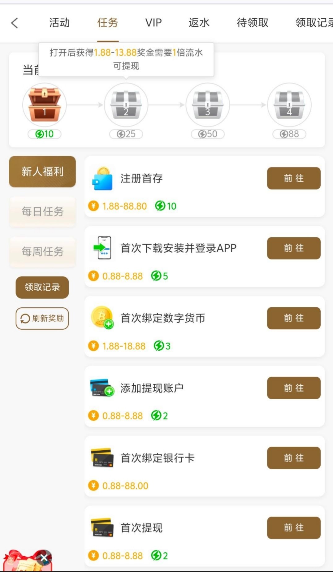 新人注册下载,登陆后自行申请,还有任务彩金,虽然不多聊胜于无。