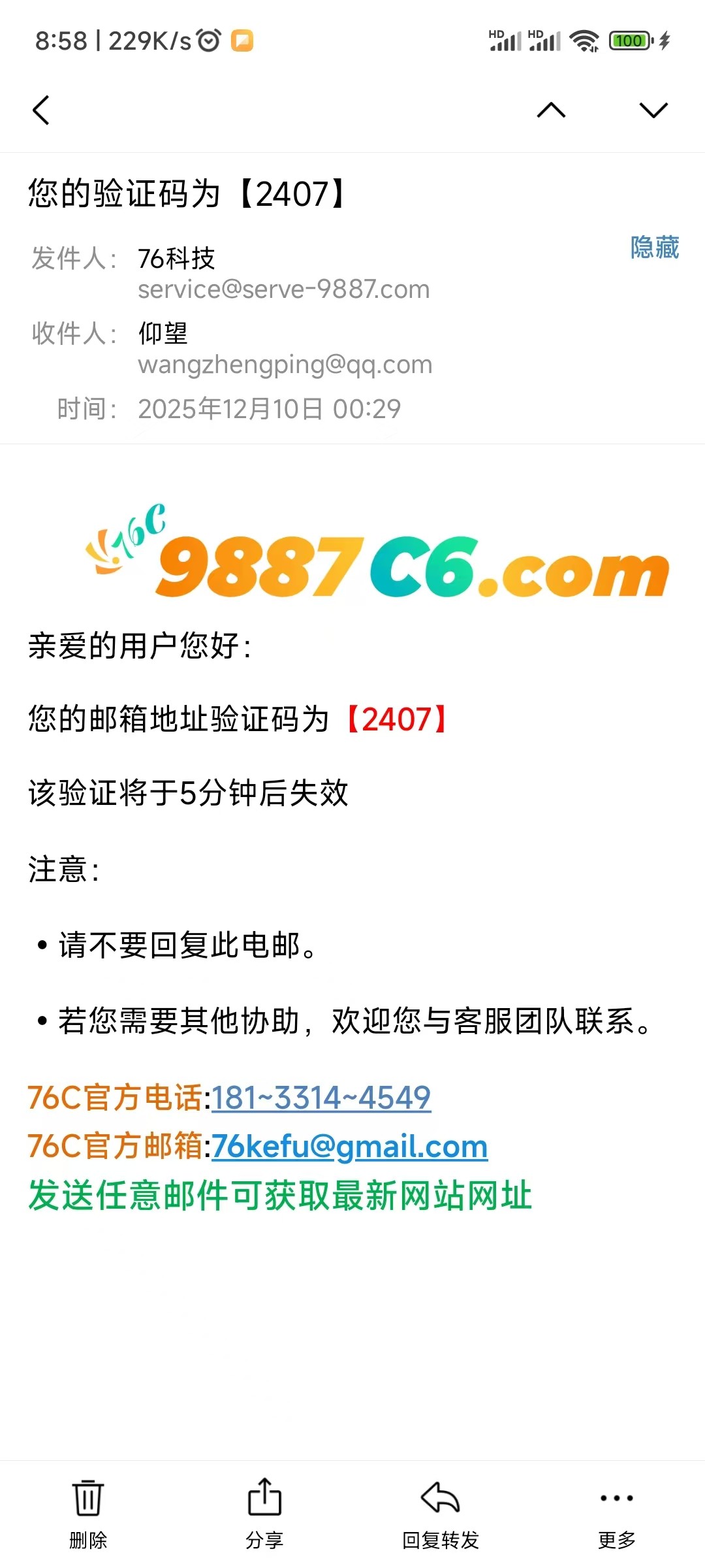 昨天看到的9887平台说邮箱彩金,注册只送8块,本以为没了,今天早上8点竟然来邮件送18彩金兑换码了,可以去撸一波,全程未充值,导航地址是080857.com,或者自己看图片上的地址就行,免得说我拉人头