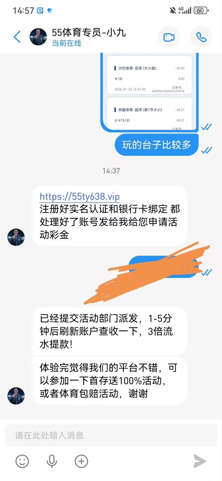 前段时间注册了没碰到,还和那个客服对骂,昨天打电话来特邀了,去找另一个客服领到了。我没打出来,体育台子概率黑,之前注册过的去碰瓷试试,查手机号,talkblink联系方式在图里