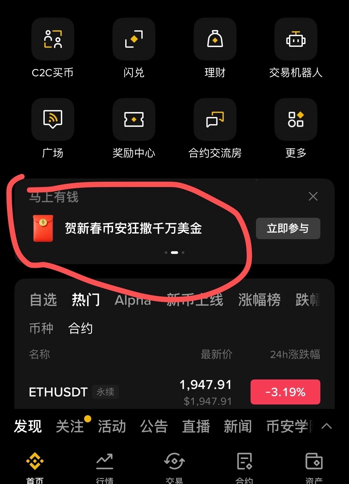 进入币安首页点击图中横幅,抢红包,我抢到5.88U