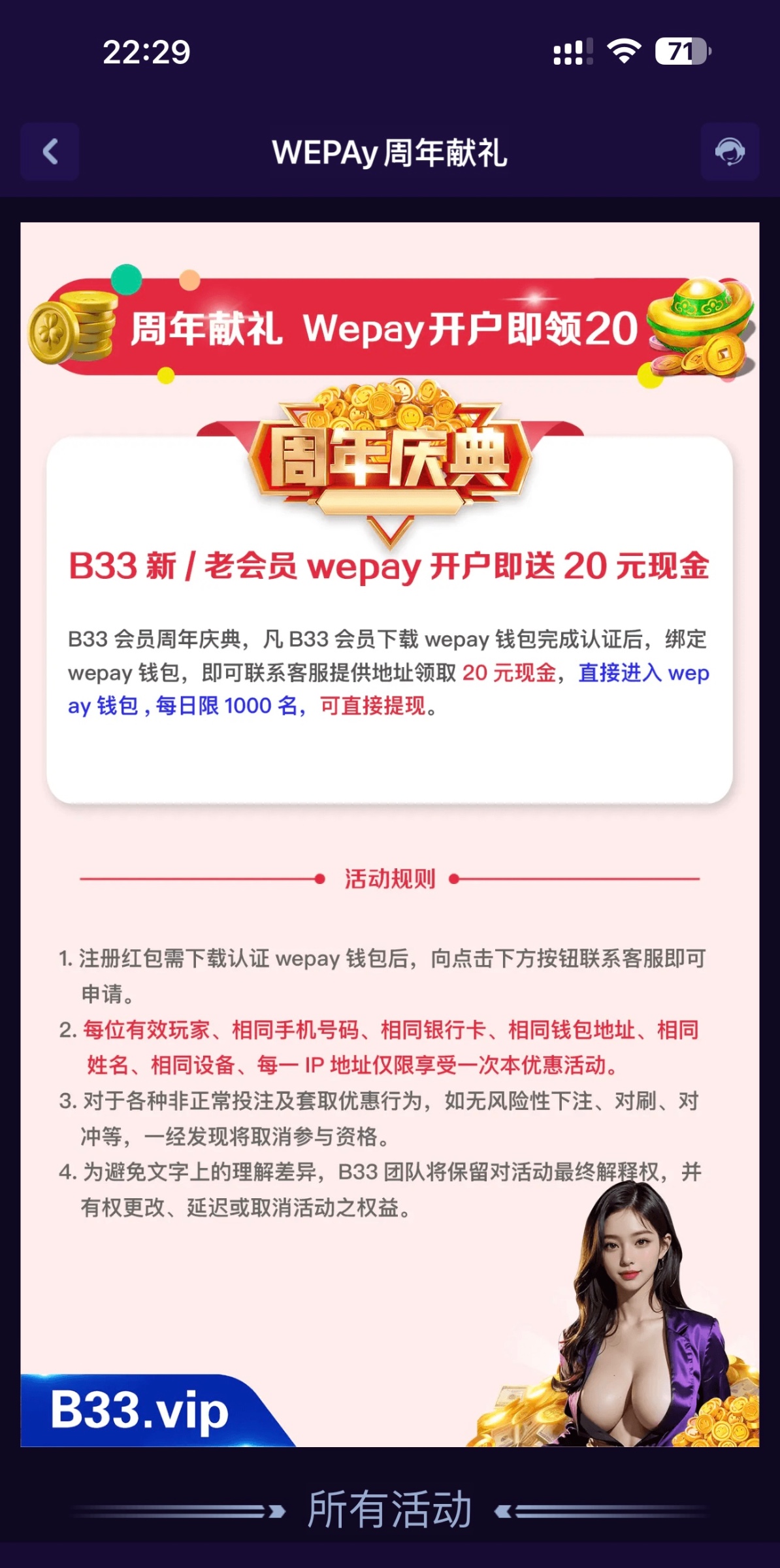 b33.vip 没什么用,领了20 都没地方充 这个台子最低冲30 套路太多了