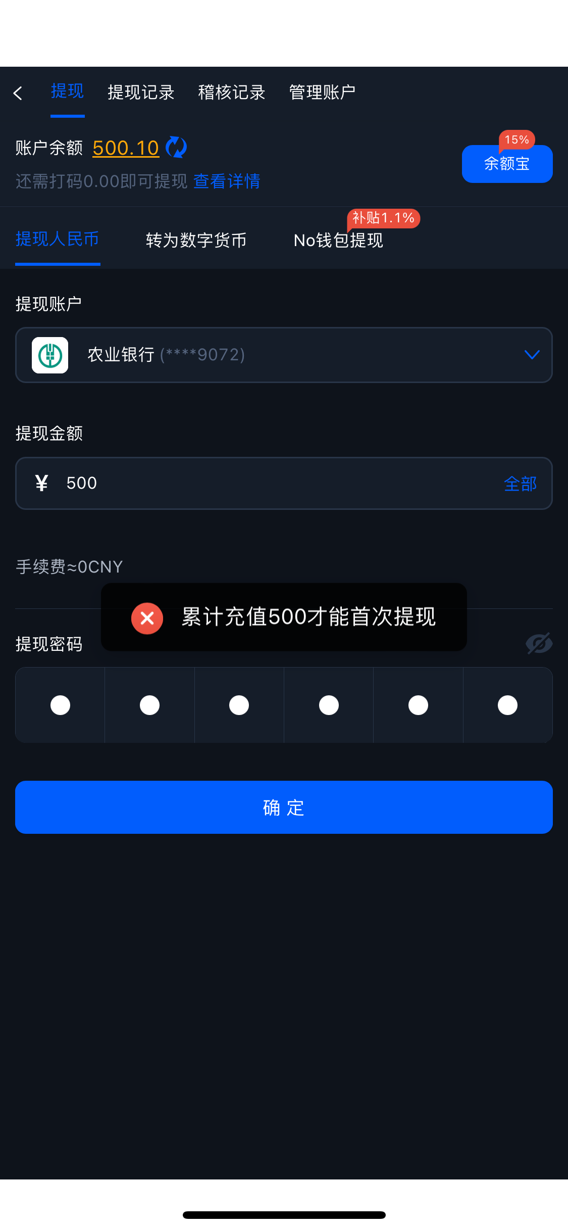累计充值500才能提现